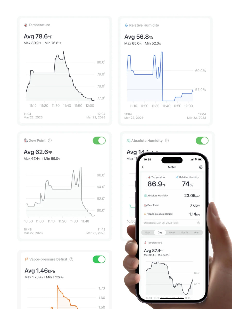 You can now view records and changes of 5 different types of data through our app, including: temperature, relative humidity, absolute humidity, dew point temperature, and VPD*.