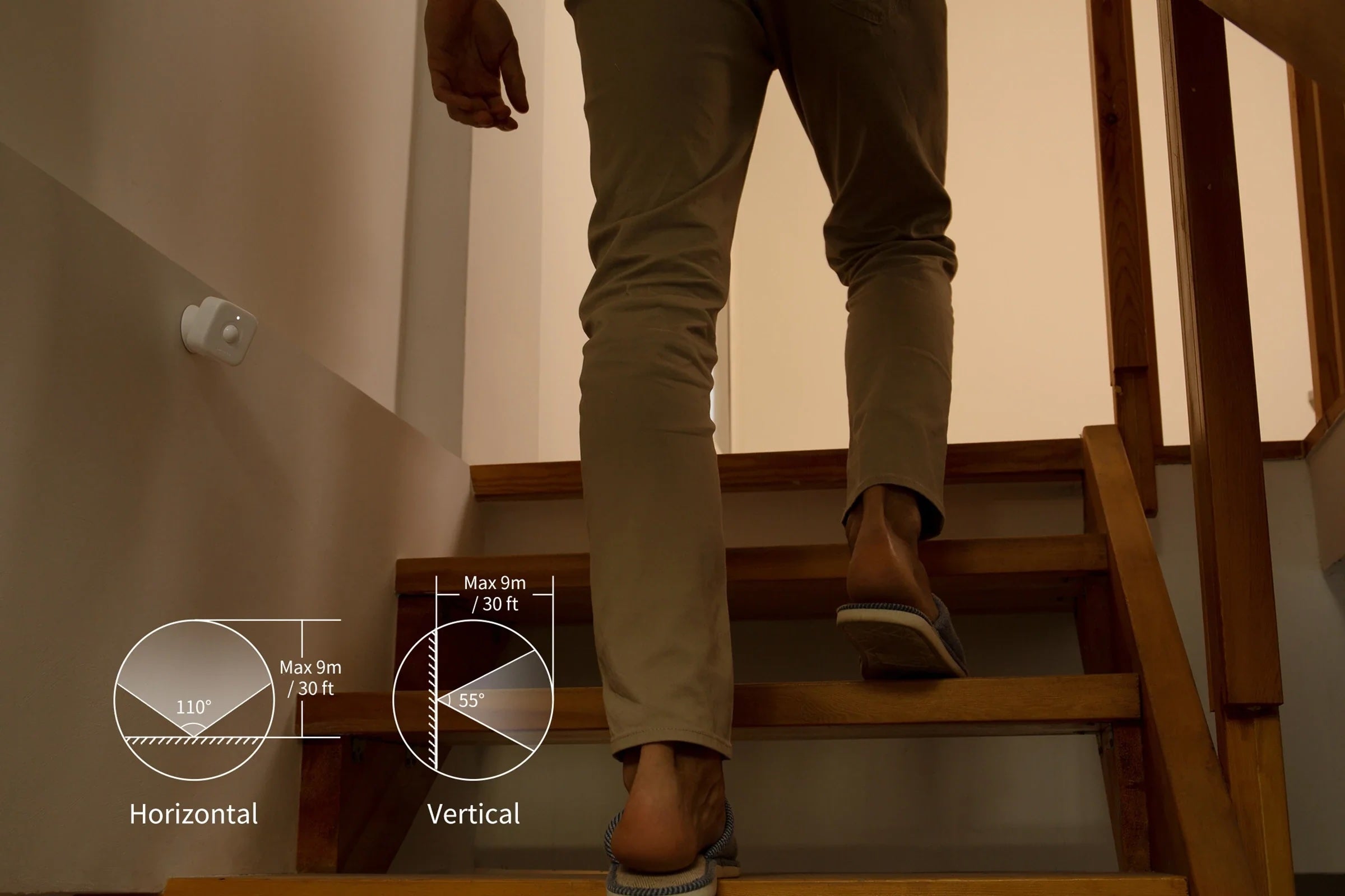 SwitchBot Motion Sensor can detect body movement across a wider area range of up to 30 ft, at an angle of up to 110° horizontally, and 55° vertically.