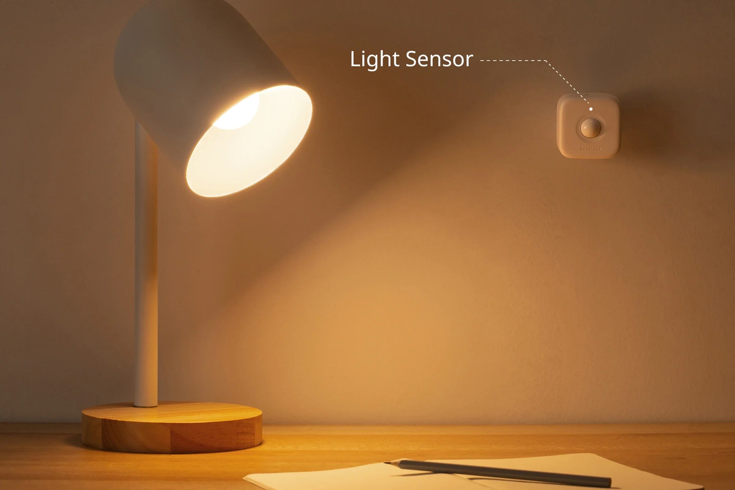 Inbuilt with a light sensor that can be used to detect what kind of light environment your surroundings are in. Then, when connected to SwitchBot Hub 2, your Motion Sensor will be able to automatically turn your desk lamp on/off when it senses light.